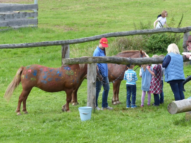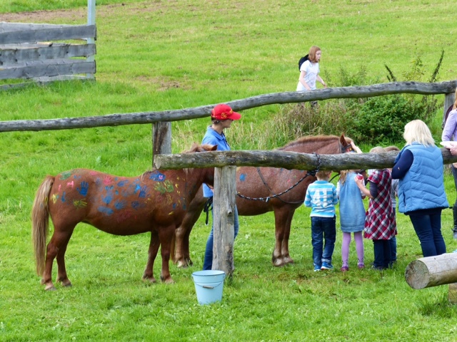 Ihr übernachtet in einer unserer Ferienwohnungen und als Highlight kannst Du direkt auf der Weide am Gasthof unsere Ponys Krümel und Jemy kennenlernen. Du darfst Sie kämmen, waschen und frisieren, lernst etwas über Hufpflege und das richtige Satteln und über Ponys allgemein. Wenn du dich traust, darfst du auch eine Runde reiten. Oder wir gehen einfach ein Stück spazieren mit den Ponys.